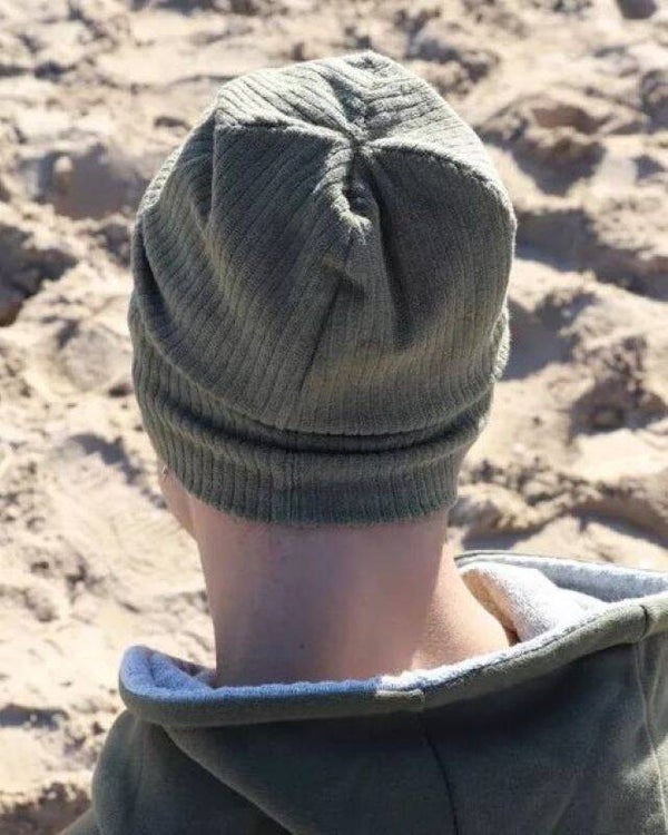 De beanie is vervaardigd van 100% dubbel geribd katoen.