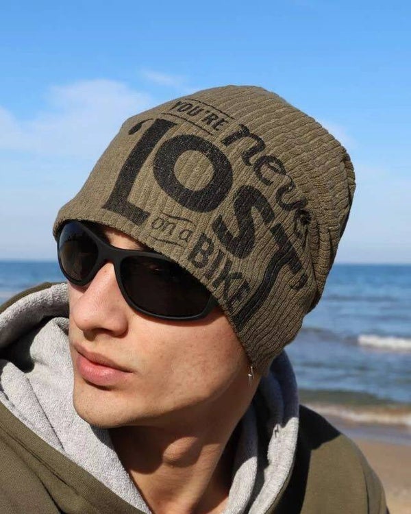Italiaanse beanie muts met zeefdruk You’re never lost on a bike in donker groen.
