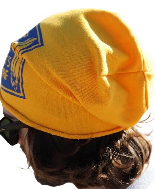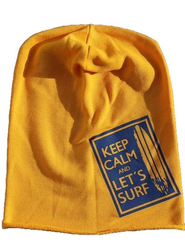 Italiaanse slouchy printed beanie: "Let's Surf" in geel.