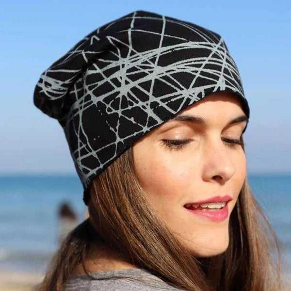 Stijlvolle Italiaanse beanie Ghirigori met een trendy zwart-witte zeefdruk.